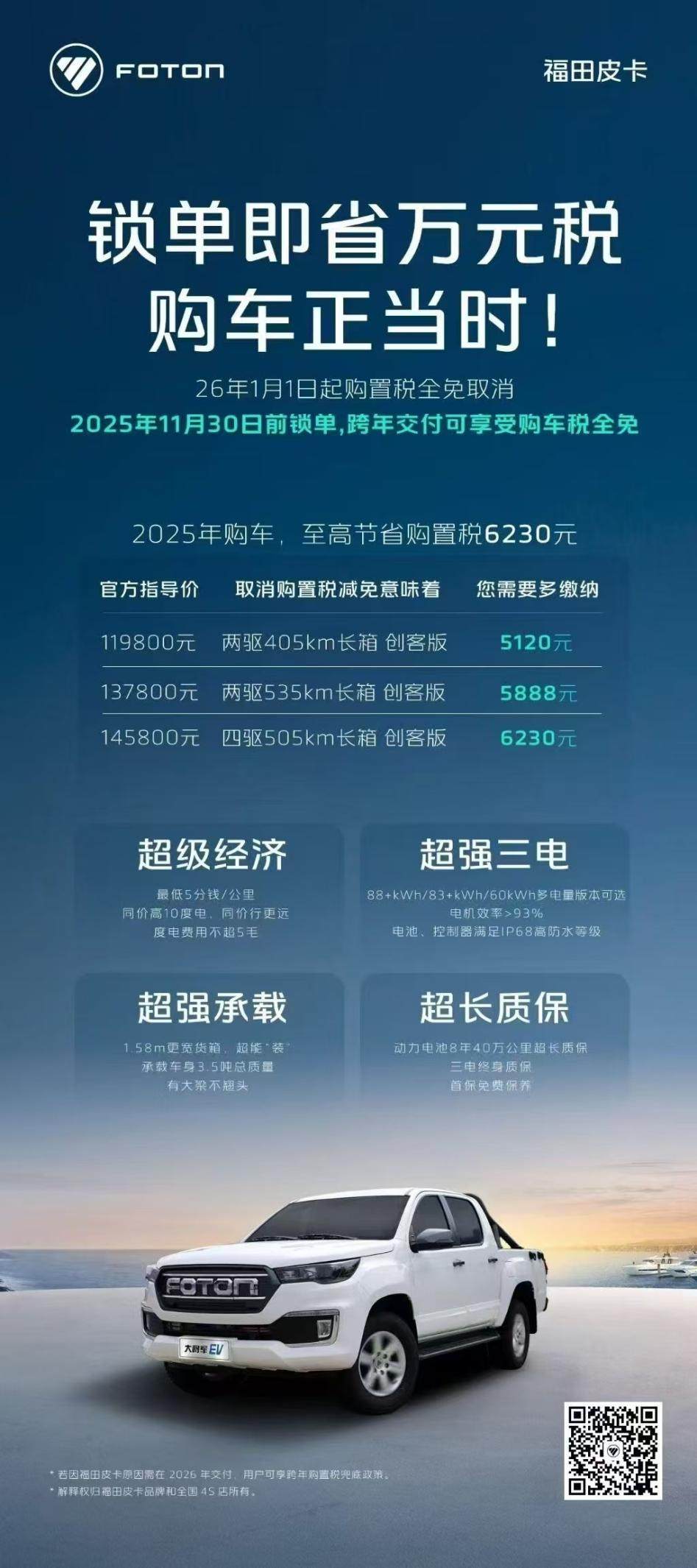 在创富路上,每一分钱都应花在刀刃上。2025年内购大将军EV创客版,享受购置税全免,至高节省购置税6230元。福田皮卡重磅推出[安心购]方案,2025年11月30日前锁单,车辆因福田皮卡原因需跨年至2026年交付,用户仍可享受购置税全免政策。这一购置政策不仅是一笔费用的节省,更是大将军EV创客版与用户并肩前行,将更多资源投入于业务拓展的诚意体现。