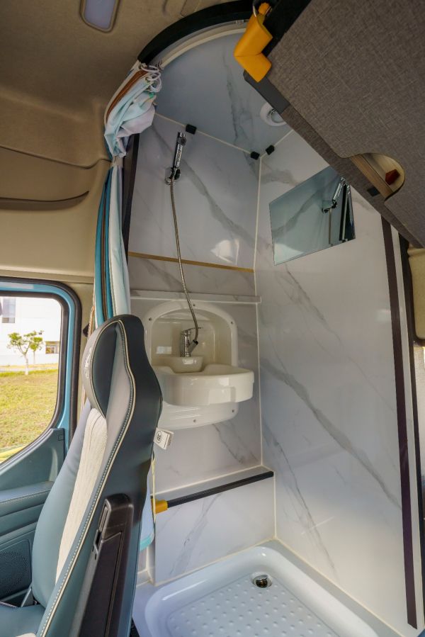 浴室整体为半封闭式结构,浅色饰板带来明亮的光线和空间放大的效果。配有精美的浴帘,能提供良好的私密空间,并设置了衣帽钩,能够放置换洗的衣物。顶部装有带照明功能的排气扇,夜间不摸黑;折叠洗手台,不占用车内空间,上面带有淋浴花洒,方便淋浴;还有一块贴心的镜子,能够让卡友在洗完澡后整理面容。